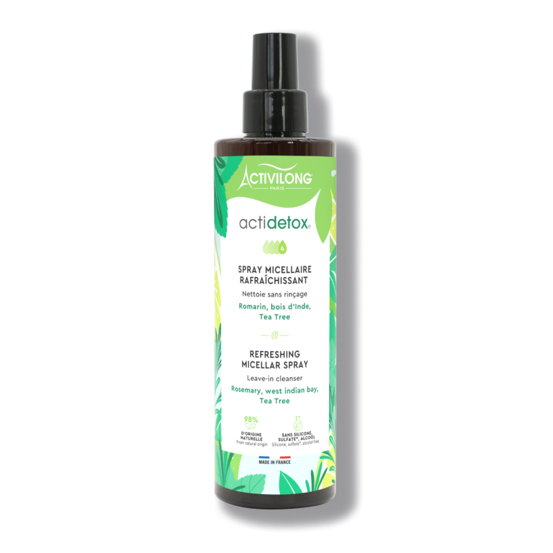 Le Spray Micellaire Actidetox Activilong est idéal pour rafraîchir et nettoyer les racines entre deux shampooings. Ce spray sans rinçage a plusieurs fonctions : il nettoie, désodorise, hydrate, rafraîchit et apaise le cuir chevelu. Sa formule naturelle assainissante et hydratante diminue durablement les inconforts du cuir chevelu.