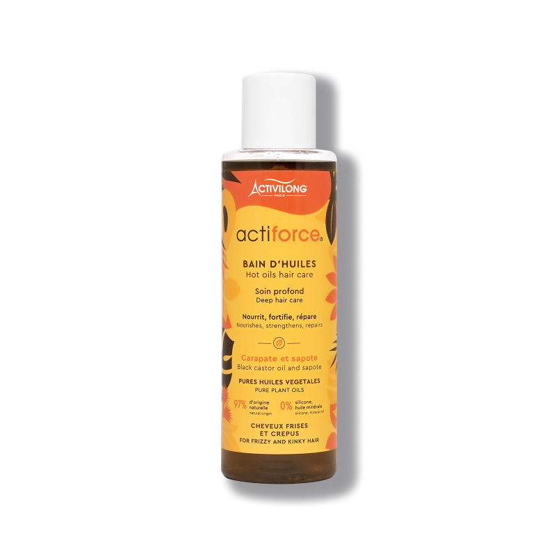 Grâce à sa combinaison d’huiles végétales pures, le Bain d’huiles Actiforce est idéal pour nourrir et restaurer les cheveux secs, ternes et endommagés. Le Bain d’huiles ACTIFORCE associe des huiles végétales pures – Olive, Ricin, Carapate, Sapote, Avocat, Sésame pour répondre aux besoins des cheveux les plus secs, ternes et cassants. Il nourrit en profondeur, hydrate, protège et apaise. Renforcée, restaurée, la chevelure gagne en vitalité et en brillance.