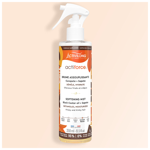 ACTIFORCE BRUME ASSOUPLISSANTE : Votre base capillaire déjà prête à l’usage ! Véritable base capillaire, la Brume Assouplissante hydrate, démêle et assouplit les cheveux sans les alourdir, permettant ainsi un coiffage facile. Enrichie en ingrédients nourrissants et hydratants, cette brume légère pénètre rapidement dans la fibre capillaire, procurant une douceur instantanée et une souplesse remarquable. Elle est idéale pour une utilisation quotidienne, offrant une solution rapide et efficace pour des cheveux toujours bien entretenus. Avec la Brume Assouplissante, dites adieu aux nœuds et aux cheveux difficiles à coiffer, et profitez d’une chevelure saine, brillante et parfaitement maniable jour après jour.