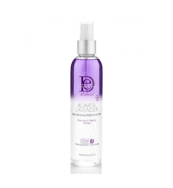 Design Essentials Agave & Lavender Blow-dry & Styling Primer est un spray qui protège les cheveux lors de l’utilisation d’outils de coiffage chauffants, mais aussi contre les UV A et UV B.  Formulé avec des extraits de Lavande et d’Agave, du beurre de Mangue, des vitamines et des anti-oxydants, il pénètre la fibre capillaire, nourrit en profondeur et renforce les cheveux affaiblis.  Design Essentials Agave & Lavender Blow-Dry & Styling Primer facilite le coiffage, minimise la casse des cheveux et réduit le temps de séchage de 50% pour un brushing bien plus rapide !
