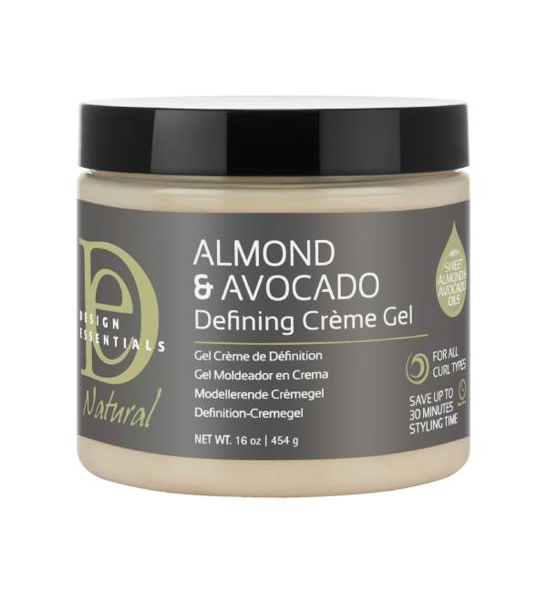 La Defining Crème Gel de la gamme Almond & Avocado de Design Essentials coiffante idéale pour définir ou créer de merveilleuses boucles sur cheveux bouclés à crépus de type 3B à 4C.