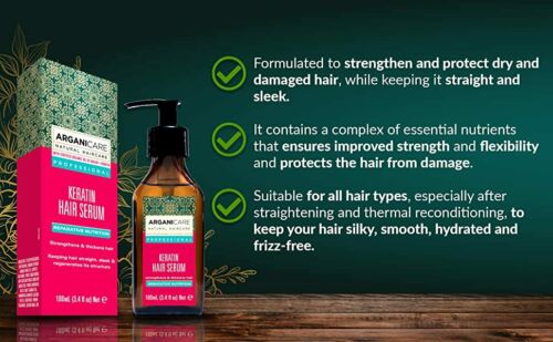 Arganicare Keratin Hair Serum est un sérum profondément nourrissant qui protège les cheveux abîmés et secs tout en aidant à renforcer les cheveux.
