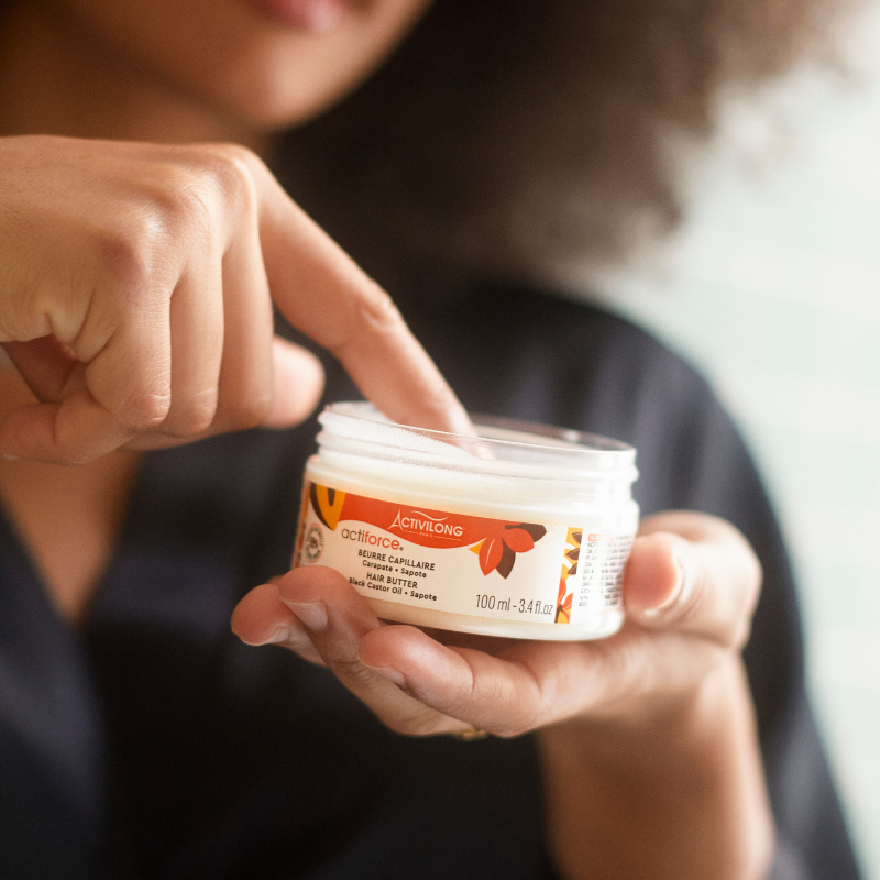 Le Beurre Capillaire Actiforce enrichi en Sapote et Carapate nourrit et protège le cheveu, mais scelle également l’hydratation permettant de maintenir les molécules d’eau dans la fibre capillaire pour un cheveu sain.