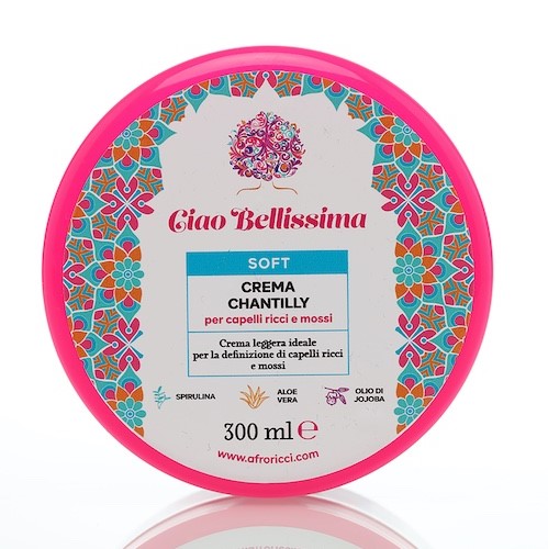 CIAO BELLISSIMA CREME CHANTILLY SOFT: La Chantilly Soft Afro Ricci Ciao Bellissima a été conçue pour les cheveux bouclés et ondulés. Il nourrit, définit et hydrate les cheveux secs, donnant des boucles définies et hydratées, ainsi que douceur et légèreté.