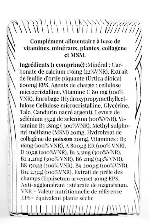 MSM (méthyl-sulfonyl-méthane) : Composé naturel de soufre, le MSM participe à la production de kératine. Il favorise la résistance et la vigueur des ongles et des cheveux, il renforce les équilibres cutanés et de prévient contre le vieillissement prématuré de la peau.