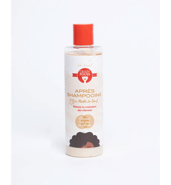 APRES-SHAMP MOELLE DE BOEUF: L’Après-shampoing dit moelle de boeuf de la marque CRAZY POUSS est soin complémentaire idéal. Il apporte hydratation, nutrition et fortification pour les cheveux. De plus, il développe la croissance capillaire et apporte brillance et éclat. Parfait pour les cheveux secs ou abimés.
