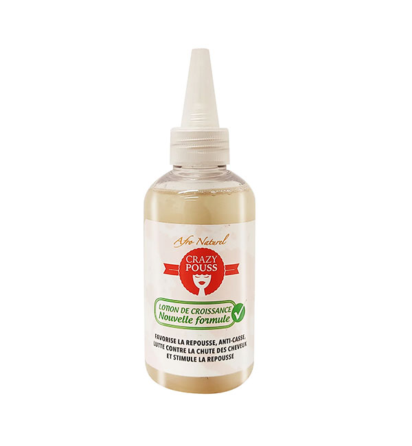 La CRAZY POUSS LOTION CROISSANCE capillaire de croissance stimule le bulbe pileux et régénère le cuir chevelu.