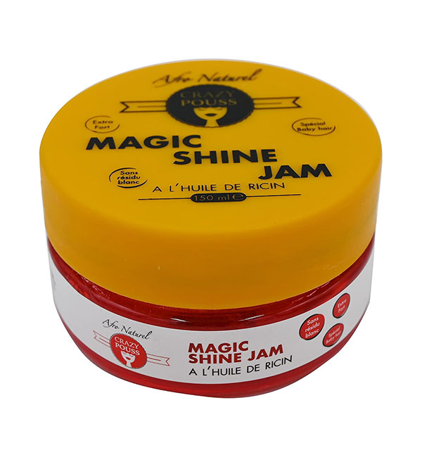 Spécialement formulé pour les cheveux bouclés, frisés et crépus, le Magic Shine Jam sculpte et fixe tous les styles de coiffures. Vous Pouvez l’utiliser pour plaquer vos baby hair, styliser vos textures ou encore des twist out. Sa texture douce et soyeuse préserve l’hydratation de vos cheveux lui apporte de la brillance. Il offre un bon maintien des vos coiffures.
