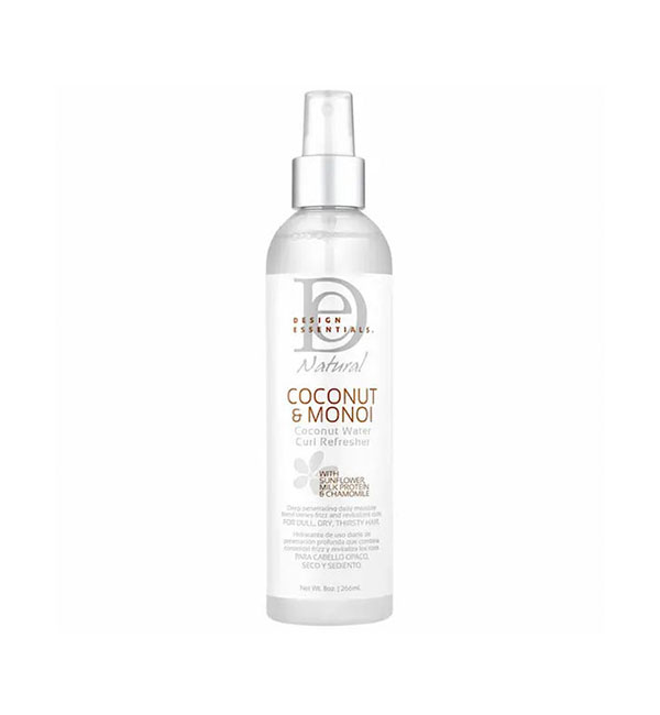 Le Rafraîchisseur de boucles à l’eau de noix de coco et de coco Design Essentials revitalise les boucles avec un mélange hydratant au monoï triple hydratation d’eau de coco, de camomille et de cerise sauvage.