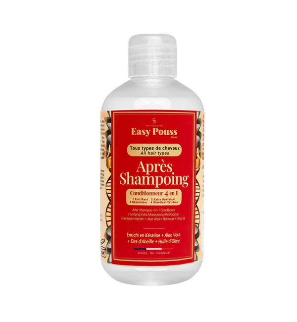 EASY POUSS APRES SHAMPOOING: Enrichi en kératine, cire d’abeille et Aloe Vera, l’Après-Shampoing Anti-Chute de Easy Pouss contribue au renforcement de la fibre capillaire et maintien l’hydratation pour des cheveux qui sont durablement protégés.