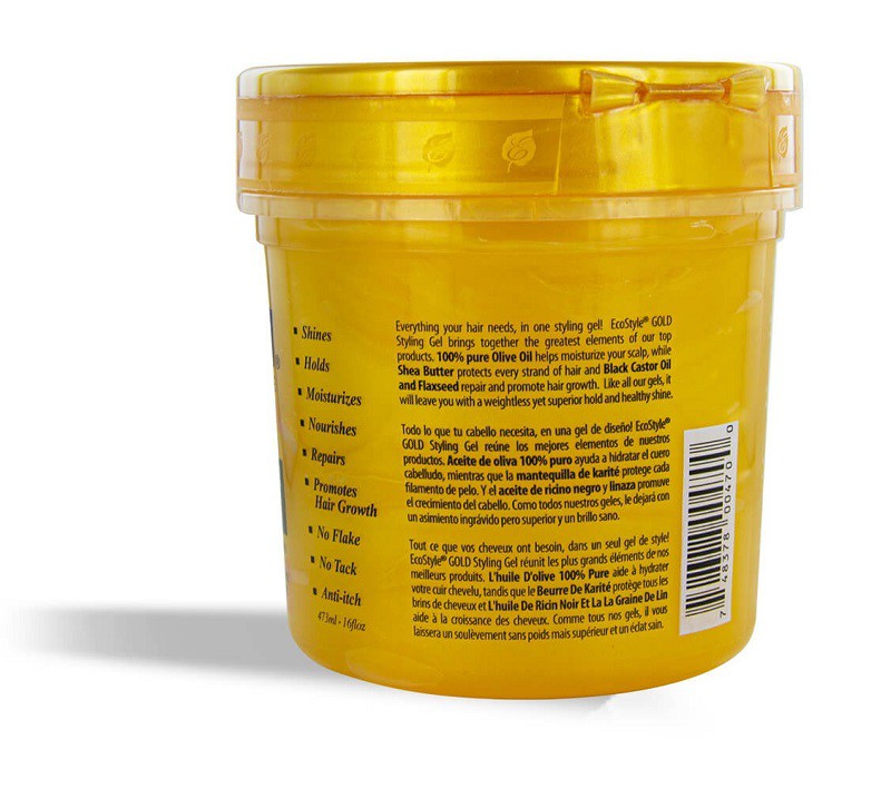 Le gel gold de la marque ECO STYLER est formulé à partir de plusieurs huiles végétales afin de préserver votre fibre capillaire tout en vous offrant une fixation optimale. Tous vos besoins capillaires sont réunis en un seul gel !!  L’huile d’olive préserve votre cuir chevelu, le beurre de karité protège votre fibre capillaire, les huiles de ricin noir et de graines de lin réparent et boostent la croissance.