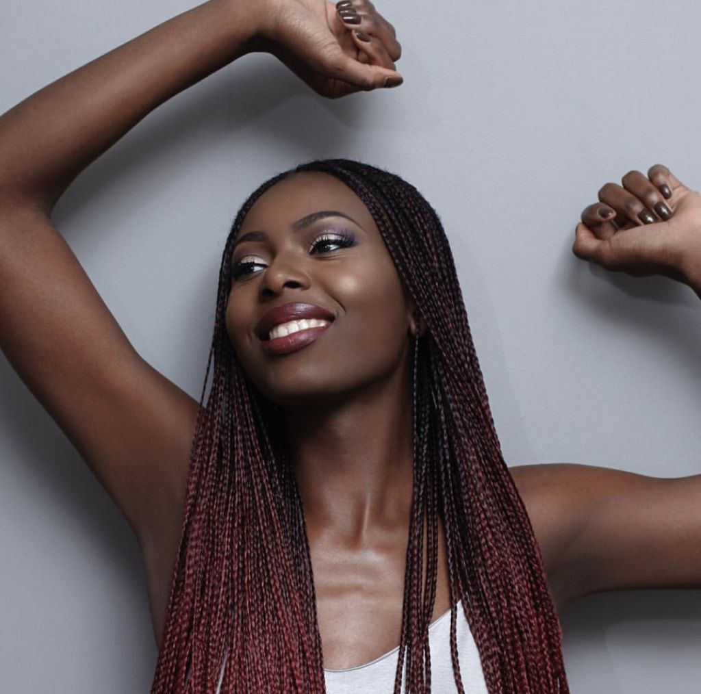 Fara est un modèle de mèches ombré Tye and Dye allant du marron foncé à la racine pour terminer au rouge flamboyant sur les pointes.