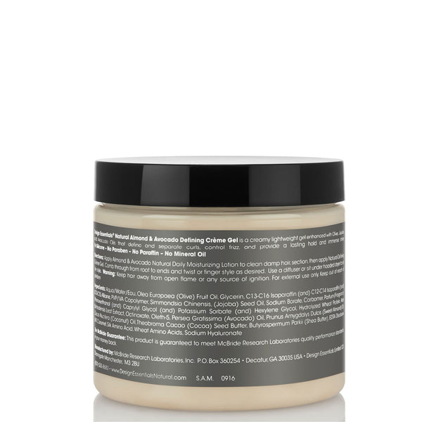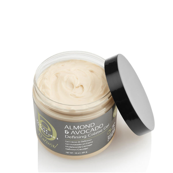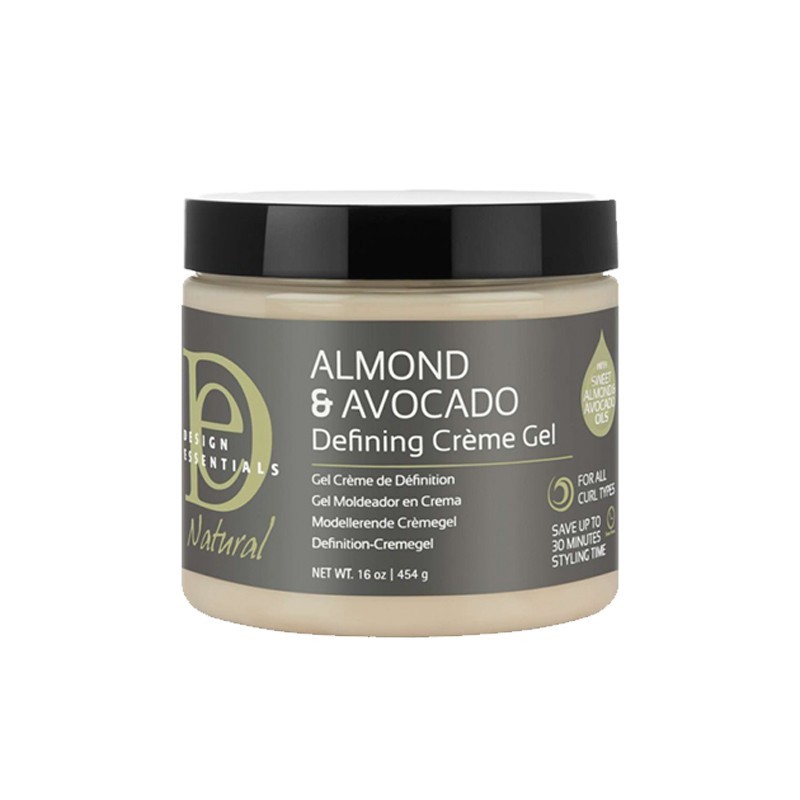 Design Essentials Almond & Avocado Defining Crème Gel hydrate les cheveux, renforce les boucles, dompte les frisottis indésirables et donne aux cheveux une magnifique brillance.  Enrichie en huile d’Avocat, la crème gel Design Essential adoucit, lisse les cheveux, tout en améliorant ainsi leur maniabilité générale. L’huile d’Amande apporte hydratation aux cheveux et nourrit le cuir chevelu, créant ainsi un environnement optimal pour la croissance.