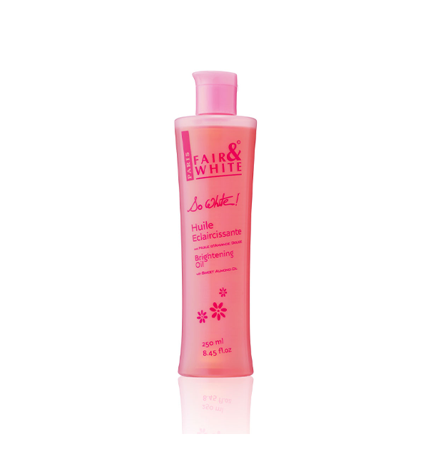 SO WHITE HUILE ECLAIRCISSANTE: L’éclat et la beauté d’une peau satinée et unifiée, grâce au complexe clarifiant et aux bienfaits nourrissants de l’huile d’Amande douce et de la Vitamine E. Délicieusement parfumée, elle atténue les taches brunes et unifie le teint. Utiliser quotidiennement en massages sur le corps en évitant tout contact avec les muqueuses.
