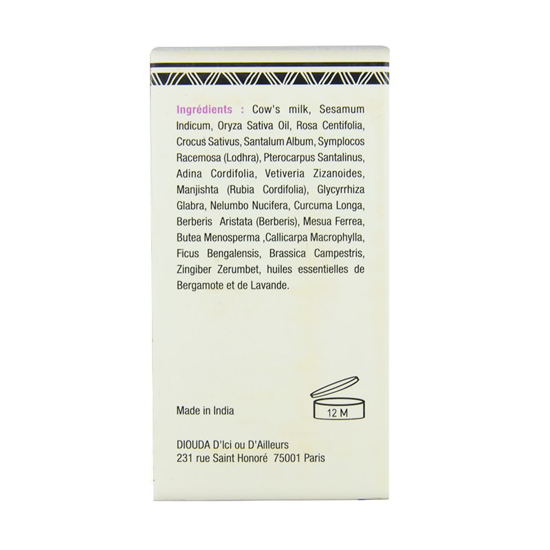 Ingrédients : Lait de vache, Sesamum Indicum (huile de Sésame) , Oryza Sativa Oil (huile de Riz), Rosa Centifolia (Rose de Damas) , Crocus Sativus (Safran), Santalum Album (bois de Santal), Symplocos Racemosa (Lodhra), Pterocarpus Santalinus (Santal rouge), Adina Cordifolia, Vetiveria Zizanoides (Vetiver) , Manjishta (Rubia Cordifolia), Glycyrrhiza Glabra (Réglisse), Nelumbo Nucifera (graines de Lotus) , Curcuma Longa (Curcuma), Berberis  Aristata (Berberis), Mesua Ferrea ,Butea Menosperma ,Callicarpa Macrophylla, Ficus Bengalensis (banian de l’Inde), Brassica Campestris (huile de graine de Chou chinois), Zingiber Zerumbet (Gingembre), huiles essentielles de Bergamote et de Lavande.