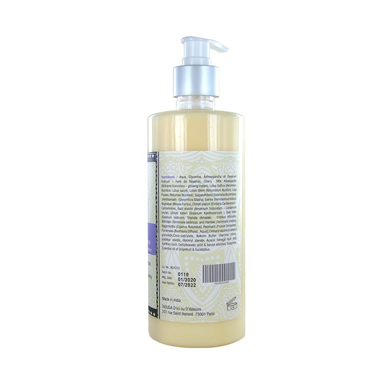 Ingrédients : Aqua, Glycerine, Ashwagandha oil (Sesamum Indicum – huile de Sésame),Cow’s Milk, Ashwagandha (Withania Somnifera – ginseng indien), Lotus Saffron (Nelumbium Nucifera- Lotus sacré), Lotus Stem (Nelumbium Nucifera), Lotus Flower, (Nelumbo Nucifera), Sugandhibala (Valeriana Brunoniana), Jeshthamadh (Glycyrrhiza Glabra), Sariva (Hemidesmus Indicus), Nagkesar (Mesua Ferrea), Chhoti elaichi (Elettaria Cardamomum – Cardamome), Badi elaichi (Amomum Subulatum – Cardamome brune ), Chhoti Kateri (Solanum Xanthocarpum ), Badi Kateri (Solanum Indicum), Triphala (Amalaki- Emblica officinalis), Bibhitaki (Terminalia bellirica), and Haritaki (Terminalia chebula), Nagarmotha (Cyperus Rotundus), Padmakh (Prunus Cerasoides), Punarnava (Boerhavia Diffusa) , Aqua]],Cetearyl alcohol & cetearyl glucoside,Coco-caprylate, Kokum Butter (Garcinia indica), Sorbitan olivate, Glyceryl sterate, Acacia Senegal Gum (and) Xanthan Gum, Dehydoacetic acid & benzyl alocohol, Tocopherol, Essential oil of Grapefruit & Eucalyptus.