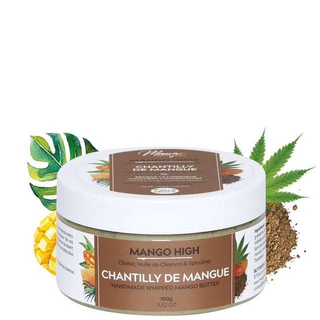 Mango High, c’est le meilleur des ingrédients pour la pousse et la retention de votre longueur. Poudre de chébé, chanvre et spiruline s’associent au beurre de mangue pour une collection haut de gamme ultra-efficace. Redensifiez vos cheveux et obtenez plus de longueur grace a cette chantilly nutritive et hydratante Mango High de Mango Butterfull! Cette chantilly fouettée est enrichie en poudre de Chébé du Tchad pour vous aidera à retenir la longueur de vos cheveux.