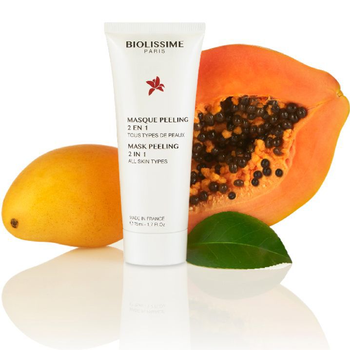 Masque peeling doux 2 en 1 aux enzymes de papaye Testé sous contrôle dermatologique. L’efficacité du Masque Doux Peeling Biolissime provient de sa composition originale, à la fois exfoliante, purifiante, matifiante et unifiante. Il associe des enzymes de papaye, qui exercent une action micro-exfoliante biologique, de la poudre de noyau d’abricot pour une exfoliation mécanique et du kaolin (argile blanche) purifiant. Ce masque permet d’avoir une peau débarrassée des impuretés, des cellules mortes et de l’excès de sébum, la peau est nettoyée en douceur, mais en profondeur. Dès la première utilisation, il a été observé que la peau est adoucie et que les pores sont resserrés. Semaine après semaine, les imperfections s’estompent, le teint est plus uniforme et son éclat est restauré.