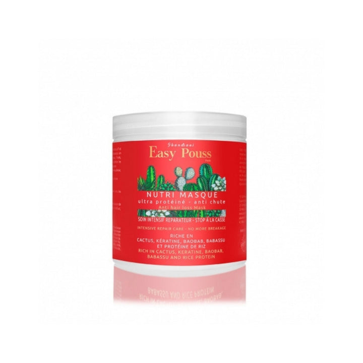 Le nutri masque réparateur ultra protéiné Easy Pouss est un soin anti chute et anti casse pour les cheveux cassants, traités chimiquement, texturisés, très frisés et crépus.