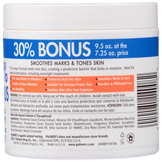 Formule au beurre de cacao de Palmer pour aider à réduire l’apparence des cicatrices et des marques. Riche en vitamine E pour aider à éclaircir les marques, le Cocoa Butter Softens Smoothes a également des propriétés cicatrisantes et tonifie la peau tout en procurant une hydratation en profondeur.
