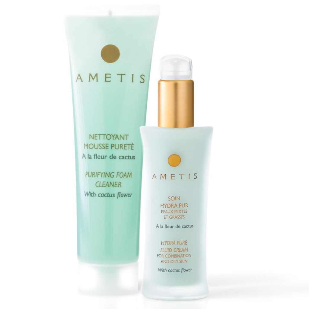 * Nettoyant moussant pur à la fleur de cactus Amétis La formule rééquilibre en douceur la peau grasse et brillante. Le concombre et la fleur de cactus purifient et hydratent la peau en même temps, et les dérivés de zinc nettoient et resserrent les pores.