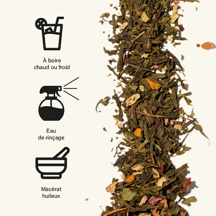 Thé Détox pour les cheveux formulé à partir de thé vert et de plantes aux vertus apaisantes, assainissantes et purifiantes.