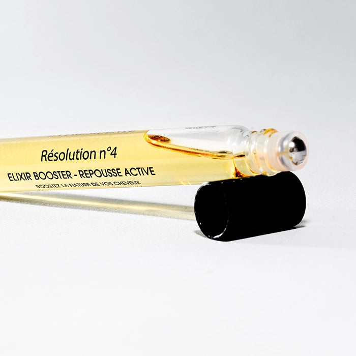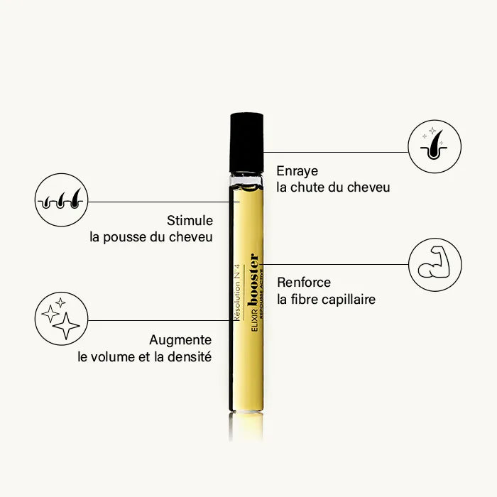 Grâce à sa composition et principalement le Capillum Fortis, Résolution n°4 Elixir Booster ancre le bulbe capillaire, favorise la pousse, influe sur la micro-circulation sanguine et apporte plus de densité aux cheveux.