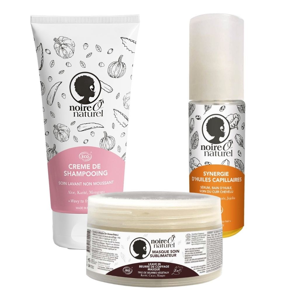 Kit Rituel de Soins Noire Ô Naturel Coffret capillaire bio comprenant les trois soins essentiels de la gamme Noire Ô Naturel pour cheveux afros naturels. Véritable programme de soin naturel sans sulfate, ni silicone pour la beauté et la pousse du cheveu ethnique qu’il soit bouclé, frisé, crépu ou défrisé ! Frais de port offert pour la France Métropolitaine.