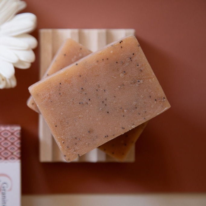 Exfoliation naturelle grâce aux graines de Coquelicot. Composé d’actifs bio végétaux et précieux : Karité, Cacao, Coco, Argan, Huile d’amande douce. Il est saponifié à froid et sans huile de palme. Mention Nature & Progrès, Fait Main en France.