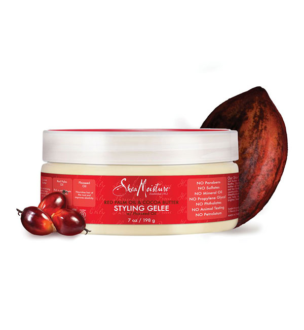 SHEA MOISTURE RED PALM OIL STYLING GELEE : Gelée de coiffage Huile Rouge & Beurre de Cacao Shea Moisture. Cheveux très frisés, crépus, sujets au shrinkage – textures 3C à 4C. A l’huile de Lin- Ingrédients issus du commerce équitable. Sans sulfates- sans parabens- sans huile de Coco- sans huiles minérales- sans PEG- non testé sur les animaux.