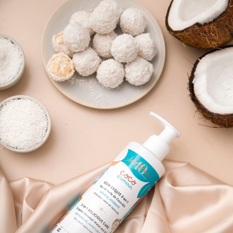 Laissez-vous séduire par notre Soin Exquis 3-en-1, une expérience capillaire à la fois légère et crémeuse ! Cette formule délicieuse, concoctée avec amour et composée d’Huile de Coco bio, d’Amour et d’Eau de coco bio fraîche, promet une prise en charge complète de vos cheveux.