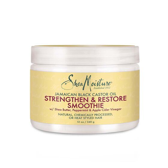 Le JBCO Strengthen & Restore Smoothie de Shea Moisture est une crème hydratante qui permet de définir les boucles naturelles ou de lisser les cheveux traités chimiquement.  L’huile de Ricin noire nutritive et le beurre de Karité se fondent dans une formule fortifiante qui restaure l’hydratation des cheveux abîmés et cassants en réduisant les frisottis.  L’huile de Menthe poivrée revigore le cuir chevelu pour une expérience stimulante.