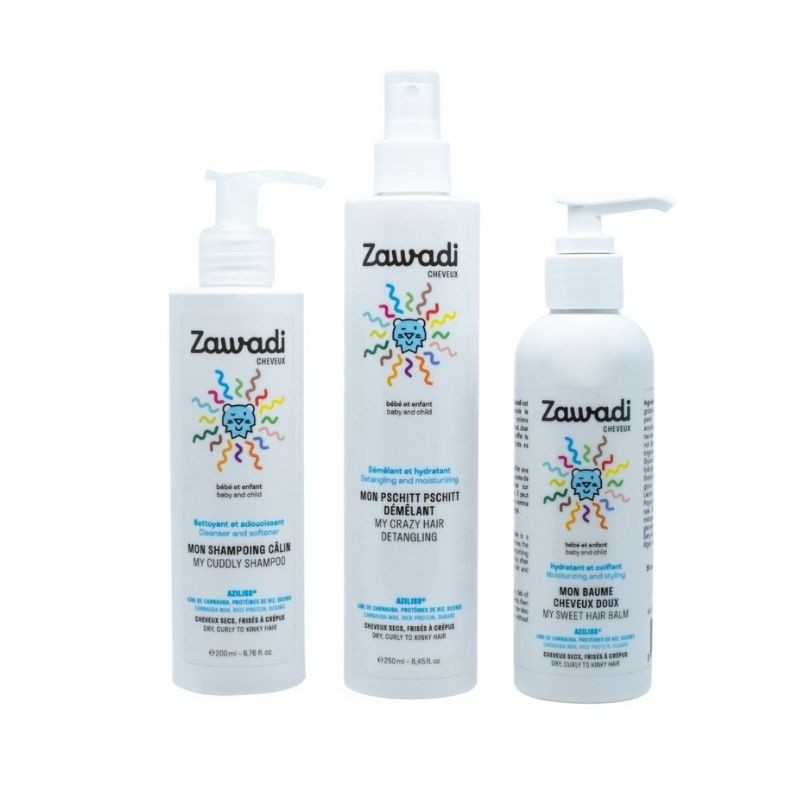 3 formules de soins fabriquées en France, utilisées pour hydrater, peigner et coiffer les cheveux crépus, crépus et secs des bébés et des tout-petits de plus de 6 mois. Le secret de cette série est la kératine végétale « Aziliss », principe actif breveté de Zawadi pour son effet anti-agglomérant. A base de cire de carnauba, de protéines de riz et de sucre, Aziliss enveloppe les écailles du cheveu. Résultat : les cheveux sont plus doux, plus hydratés et plus faciles à coiffer sans s’emmêler. My Hug Shampoo épouse les cheveux sans piquer les yeux. Il est à base de jus de pomme et lave les cheveux en douceur sans les dessécher. Il nettoie en douceur le cuir chevelu avec du jus de pomme. Aucun conditionneur nécessaire ! Le Baume Cheveux Douceur s’utilise en soin coiffant sans rinçage, sans rinçage. Un incontournable de la série : Detangling Pschitt Pschitt basé sur Aziliss ! Le spray effet kératine peut être utilisé avant/après le shampooing.
