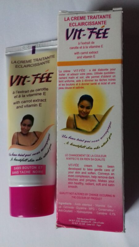 La crème Vit-Fee a été développée pour adoucir et prendre soin doucement de votre peau. Cette crème transmet un teint homogène, aide à éliminer les blocs et boutons foncés. Rendre votre peau saine, radieuse, douce et satine lisse. Ingrédients: Acide stéarique vitamine Eauuecécérimide glycérine MPG antioxydant de réserve carotène d’hydroquinone 0,1% Fabrique Par Rodis